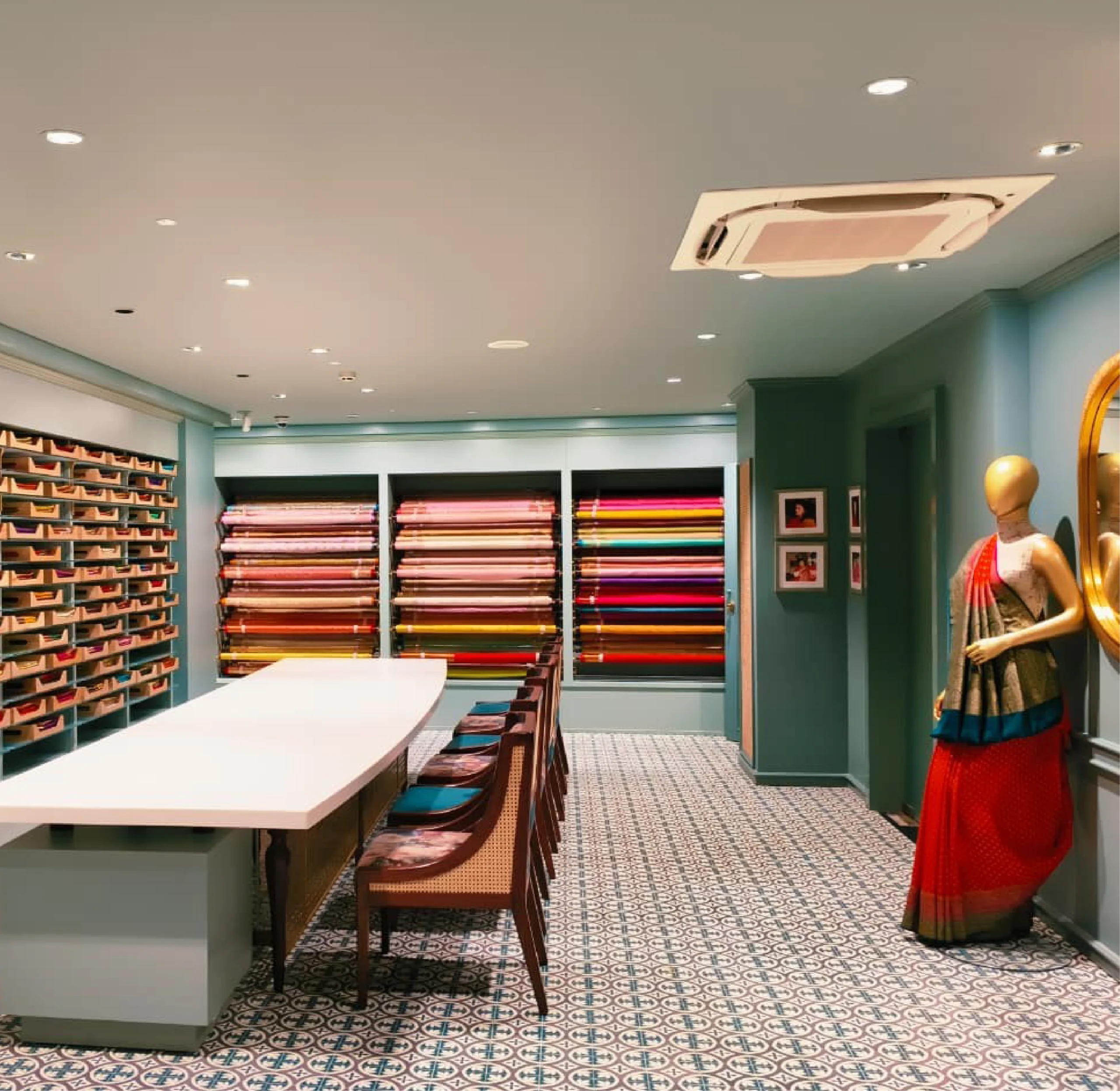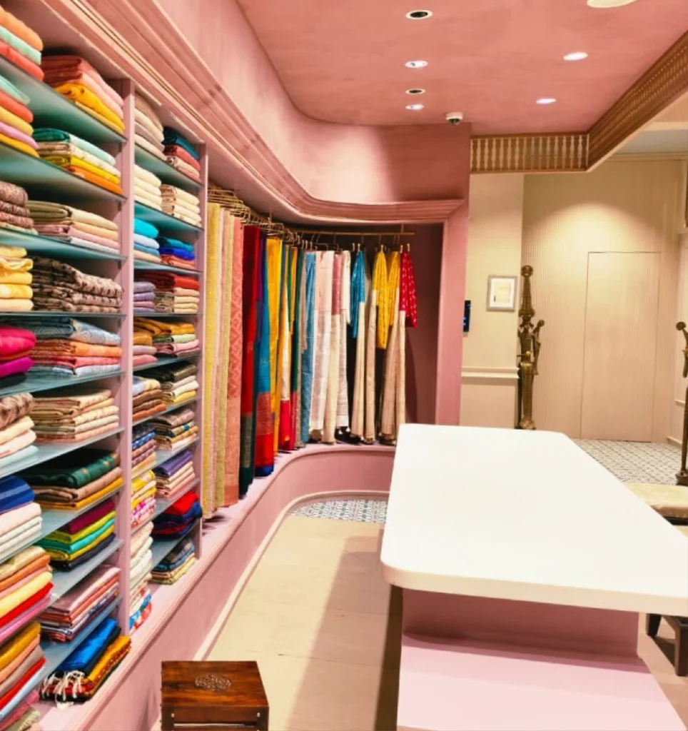 About ProjectAbout Project Description The Vijayalakshmi store in Hyderabad is designed as a boutique-style retail space blending modern and traditional elements. The interior features a hallway leading into the retail area with a patterned carpet tiled look, wooden-and-cane chairs, and tables displaying fabrics. The ambiance is sophisticated yet inviting, catering to a premium shopping experience. …